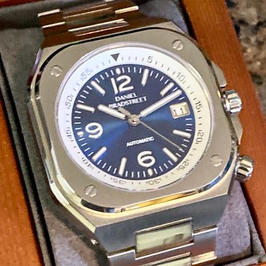 The beautiful modern styling of this Daniel Bradstreet™ "Ultra" Automatic Watch model features a square case and internal timing bezel operated by a second crown. Rugged Quality, 42mm Stainless steel case with a reliable Japanese automatic movement by Seiko. Blue Sunray Dial with Lumed Hands. Fitted Stainless Steel bracelet, and comes with an extra blue rubber strap. 200 Meter water resistance. Comes in a padded leatherette box.