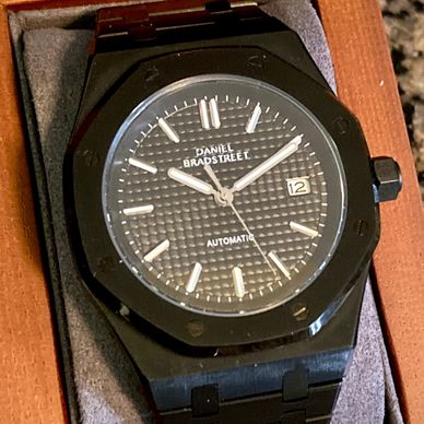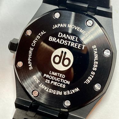LIMITED PRODUCTION Only 25 pcs! The beautiful styling of this Daniel Bradstreet™ "Black Panther" Automatic Watch model was inspired by the luxury steel sports watches of the 1970s. Rugged Quality, Heavy Black PVD 42mm Stainless steel case and screw-down crown with a reliable Japanese automatic movement by Seiko. Black Waffle Dial with Lumed Hands.and indexes. Fitted Stainless Steel bracelet. 30 Meter water resistance with Screw-down Crown. Comes in a padded leatherette box.