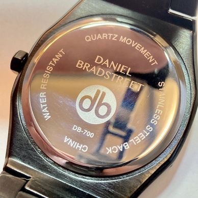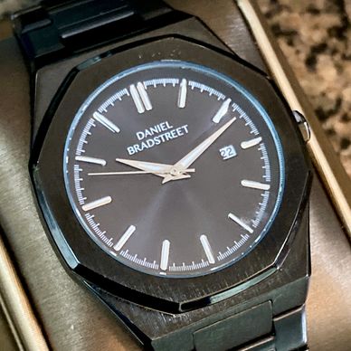 The Daniel Bradstreet™ "Black Shadow" Quartz Watch is a more affordable version of our "Black Panther" Automatic model, inspired by the luxury steel sports watches of the 1970s. Black PVD 42mm case. Black Sunray Finish Dial with Lumed Hands.and indexes. Stainless Steel caseback and bracelet. 30 Meter water resistance. Comes in a cardboard gift box.